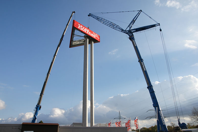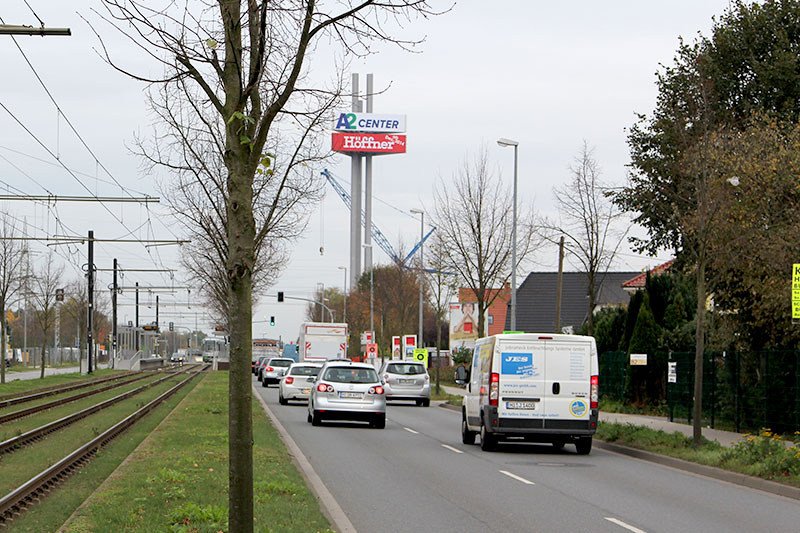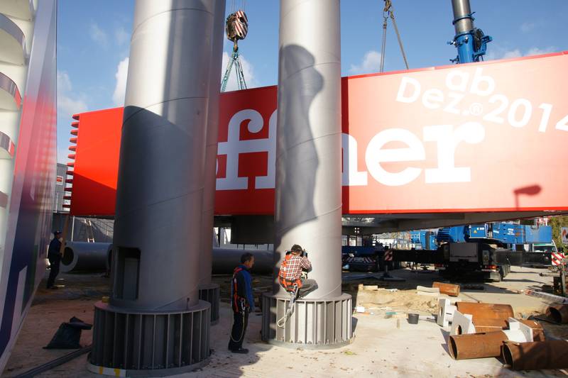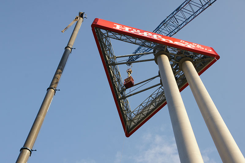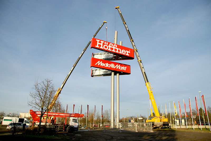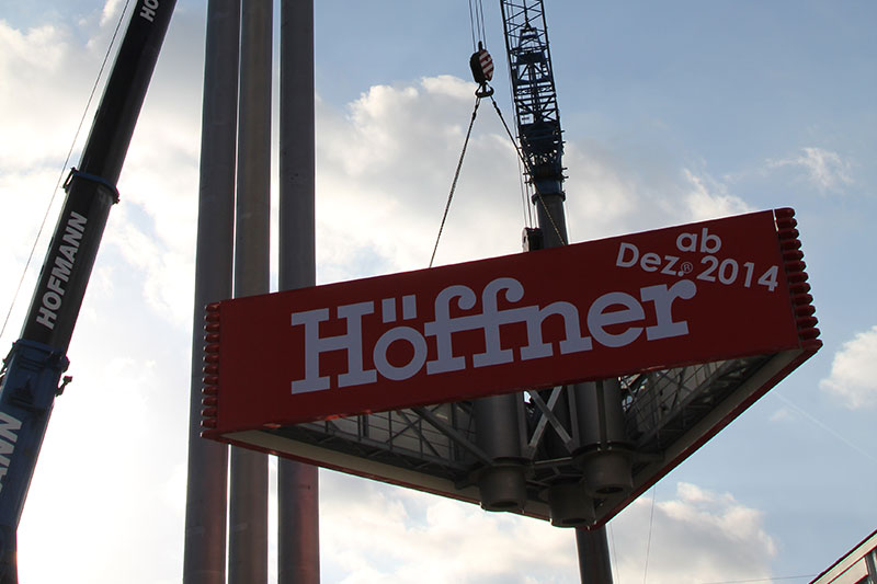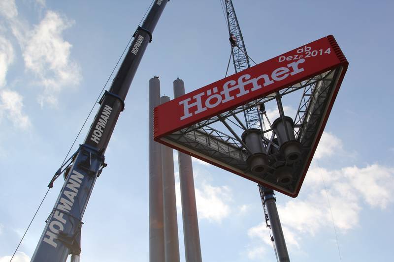 190 Tonnen Gesamtgewicht, 2 Werbevitrinen mit 17 x 4 m Schenkellänge. Ein neuer gigantischer Werbeturm lenkt ab November 2013 die Aufmerksamkeit auf das A2-Center und den im nächsten Jahr eröffnenden Höffner in Hannover-Altwarmbüchen.