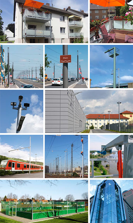 Unsere Stärken sind die Entwicklung CI-orientierter Konstruktionen, darunter in erster Linie Werbetürme, Flutlichtanlagen sowie Maste für die unterschiedlichsten Einsatzbereiche und diverse Bauten aus Stahl, wie Balkone, Straßenbahn-Haltestellen uvm.